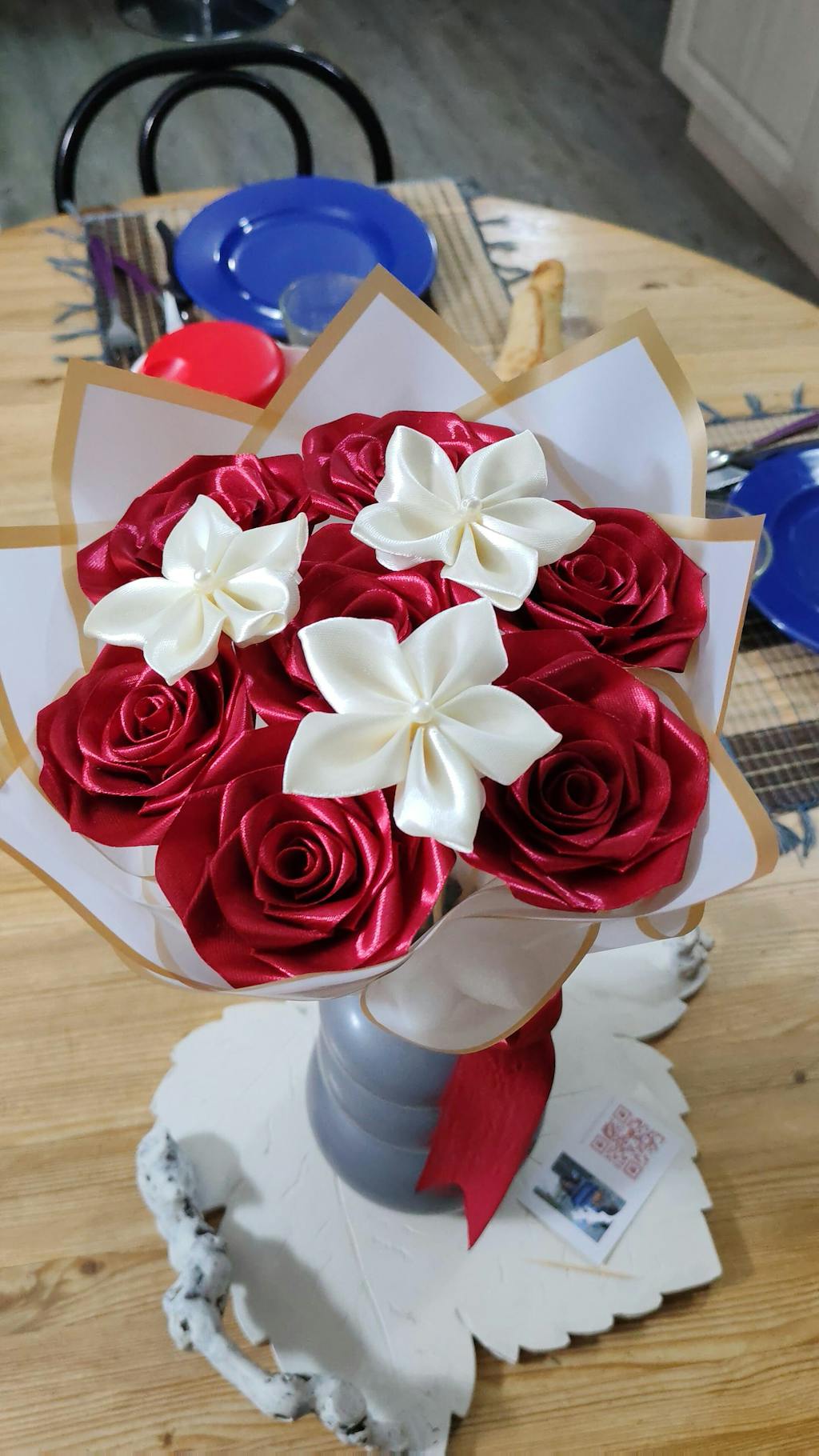 Bouquet de fleurs en satin 100% fait main composés de 7 roses carmins et 3 petites fleurs ivoires. Emballage blanc et doré.